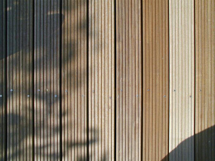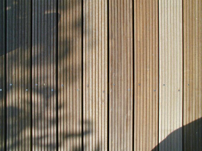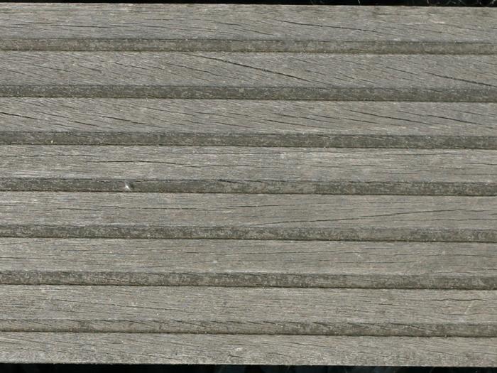 Unbehandelte Holzoberflächen verändern sich unter dem Einfluss der Witterung. Der Prozess der Verwitterung verursacht die typische Vergrauung der Oberfläche und Rissbildung. Diese typischen Radialrisse verlaufen parallel der Holzfasern und bewirken im Regelfall keine Beeinträchtigung der Statik. Das Bild zeigt eine unbehandelte Terrassendiele aus Bangkirai nach mehrjähriger direkter Bewitterung.