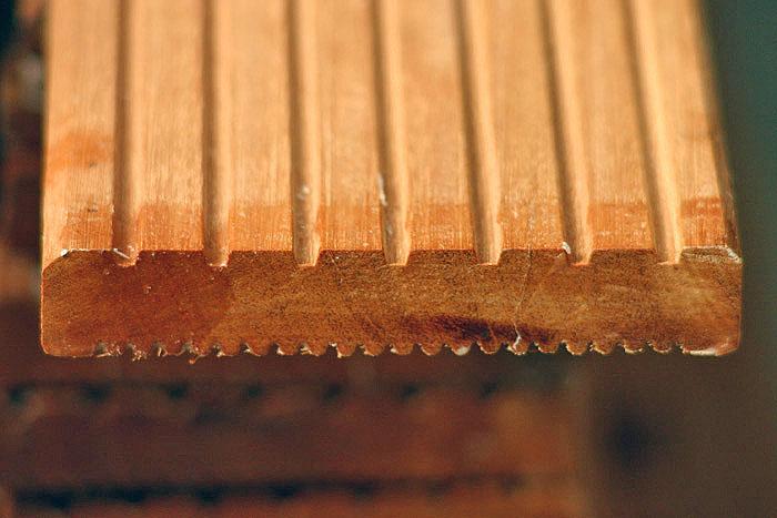 Die Oberfläche der Bangkirai-Hölzer kann stellenweise etwas rauh sein. Diese Rauhigkeit kann durch den Faserverlauf oder Unregelmäßigkeiten bei der Bearbeitung verursacht worden sein. In der Regel treten diese rauhen Stellen nur in Handflächengröße auf. Das Überschleifen mit einem Schwingschleifer sorgt für Abhilfe.
