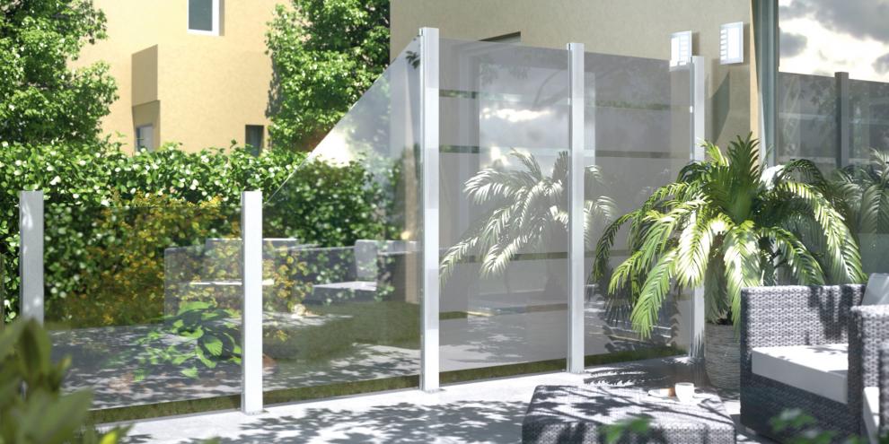 Das Zaunsystem SYSTEM GLAS bringt Leichtigkeit und Transparenz auf Ihre Terrasse. Das System besteht aus Elementen mit 8 mm starkem Einscheiben-Sicherheitsglas und den metallicfarbenen Alu-Pfosten (2 Halbpfosten). In die Pfosten können sowohl die Glaselemente als auch die Elemente aus dem Zaunsystem SYSTEM