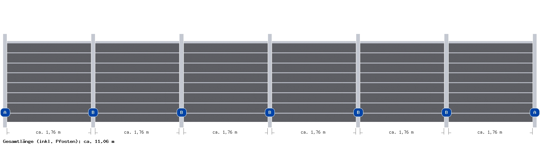 Übersicht der gesamten Zaunanlage Nehmen Sie aufgrund der hier im Planer angegebenen Maße keine Fundamentarbeiten vor! Vorrang vor den hier angegeben Maßen haben die Angaben in der Montageanleitung .