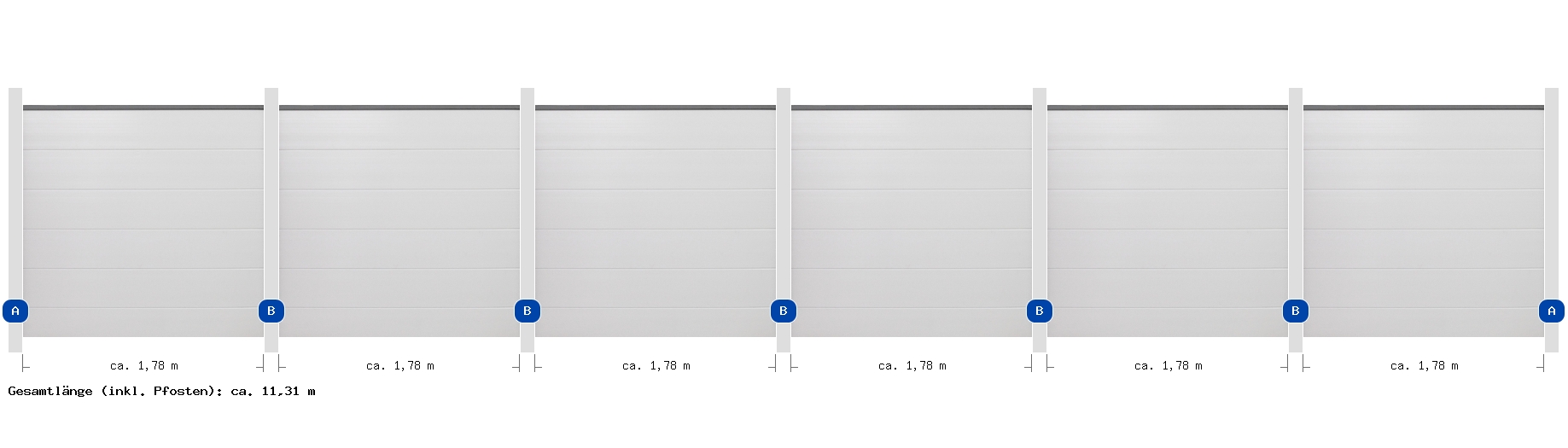 Übersicht der gesamten Zaunanlage Nehmen Sie aufgrund der hier im Planer angegebenen Maße keine Fundamentarbeiten vor! Vorrang vor den hier angegeben Maßen haben die Angaben in der Montageanleitung .