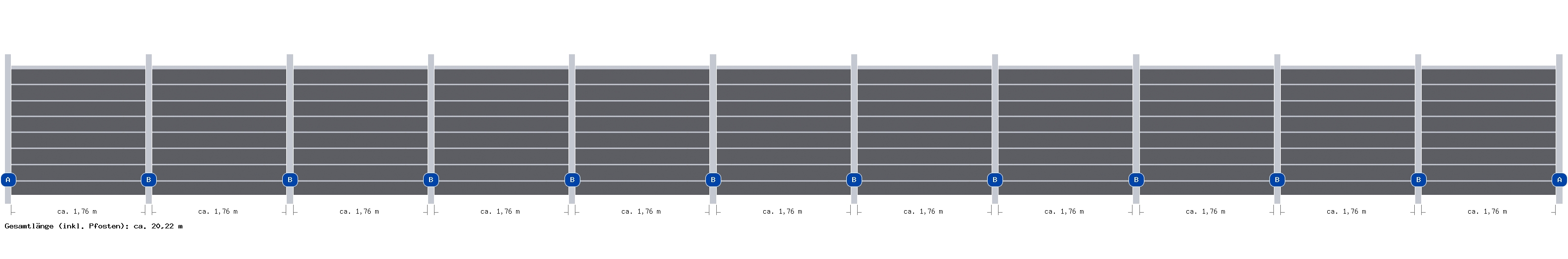 Übersicht der gesamten Zaunanlage Nehmen Sie aufgrund der hier im Planer angegebenen Maße keine Fundamentarbeiten vor! Vorrang vor den hier angegeben Maßen haben die Angaben in der Montageanleitung .
