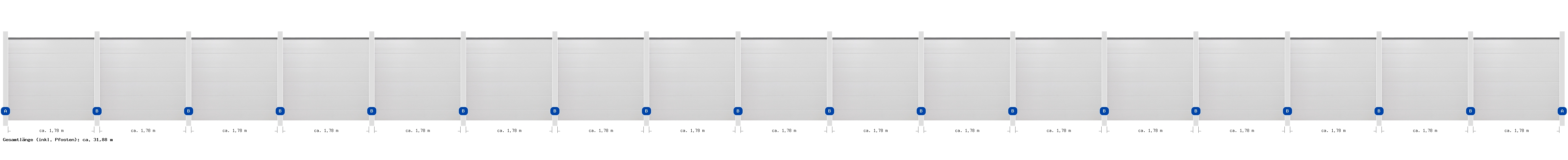 Übersicht der gesamten Zaunanlage Nehmen Sie aufgrund der hier im Planer angegebenen Maße keine Fundamentarbeiten vor! Vorrang vor den hier angegeben Maßen haben die Angaben in der Montageanleitung .