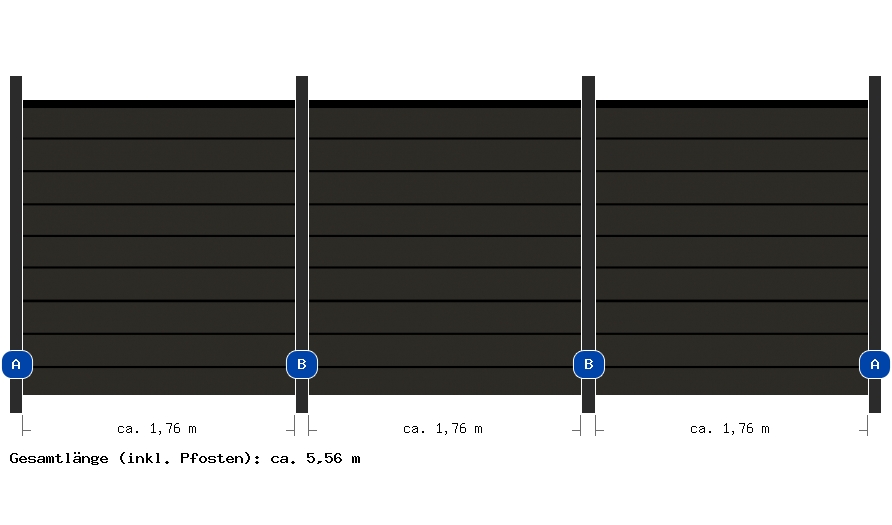 Übersicht der gesamten Zaunanlage Nehmen Sie aufgrund der hier im Planer angegebenen Maße keine Fundamentarbeiten vor! Vorrang vor den hier angegeben Maßen haben die Angaben in der Montageanleitung .