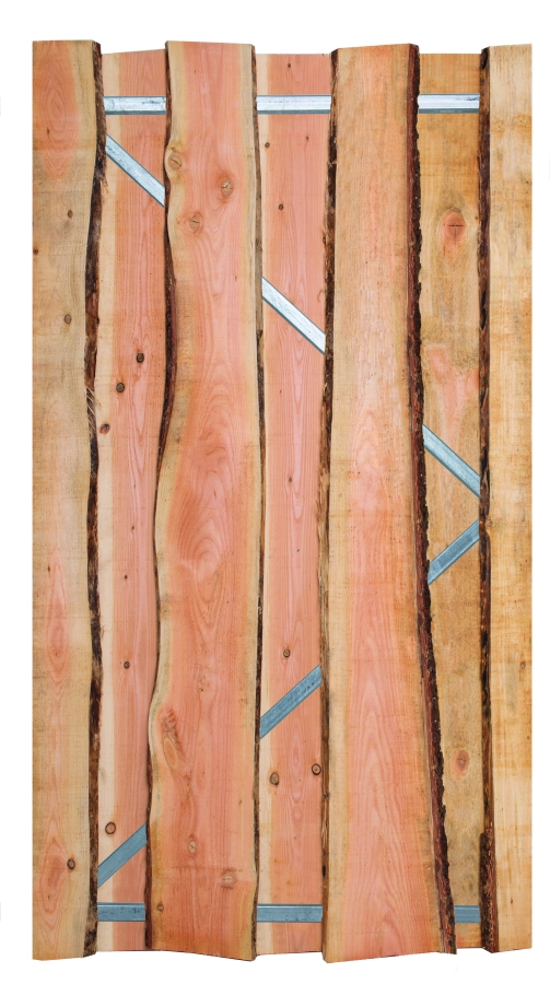 Zaunprofile sind Edelstahl verschraubt, Stahlrahmen, unbesäumt (mit Baumrinde)