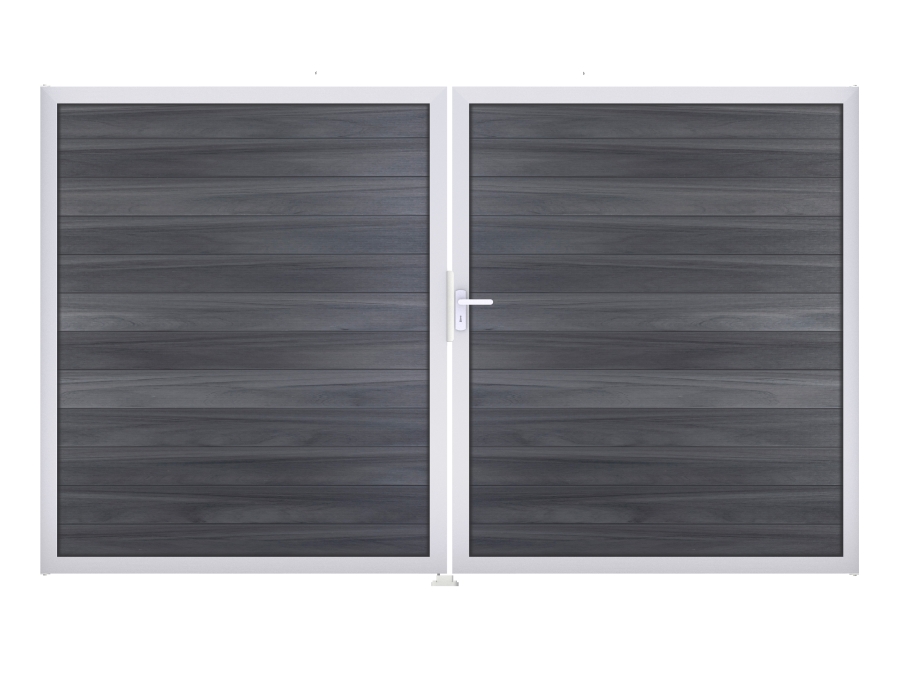 Das hochwertige Doppeltor ist mit einer Füllung aus BPC gefertigt, einer widerstandsfähigen Materialmischung, die zu etwa 60% aus Bambus und zu 40% aus Kunststoff besteht. Diese Füllung ist von einer zusätzlichen, coextrudierten Kunststoffschicht umgeben. Der Rahmen des Tores hingegen ist aus eloxiertem Aluminium hergestellt und damit ebenso von hoher Qualität.