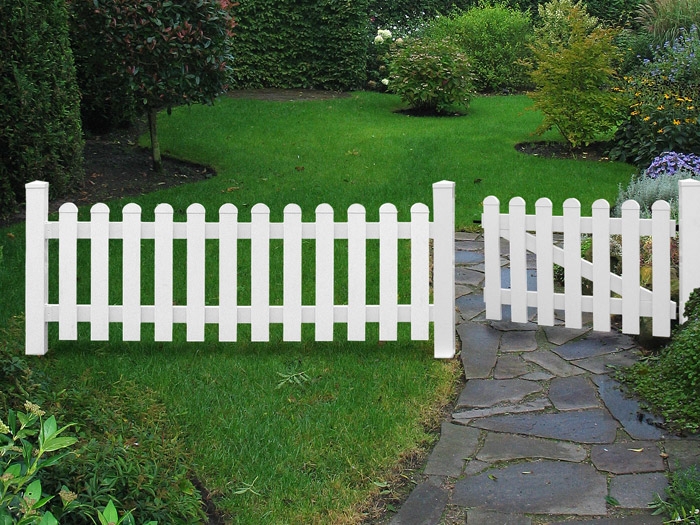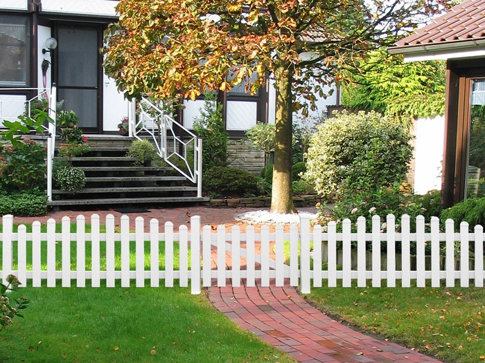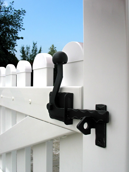 halbrunde Lattenkappen in Lattenfarbe, Schrauben, Ladenbänder schwarz, Gartentorfalle