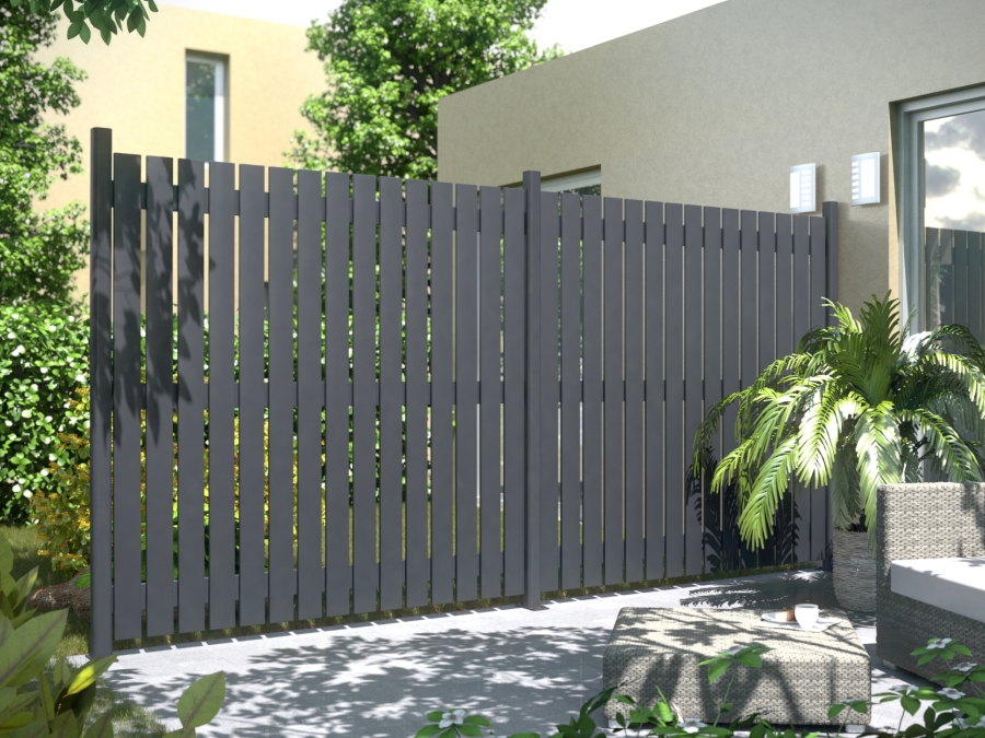 Das Modell ist ein Lamellenzaun aus Aluminium, der mit einer Pulverbeschichtung in Anthrazit versehen ist. Mit einer Breite und Höhe von jeweils 180 cm eignet er sich hervorragend, um unerwünschte Blicke abzuhalten und gleichzeitig ein stilvolles und modernes Designelement in Ihrer Gartengestaltung zu sein. Durch die geringe Stärke von 2,5 cm lässt sich der Zaun dezent in jeden Garten integrieren.